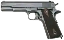 The Colt Model 1911 is a 7+1-round, single-action, semi-automatic, magazine-fed, recoil-operated pistol chambered for the .45 ACP cartridge.[35] It served as the standard-issue sidearm for the United States Armed Forces from 1911 to 1986, however, due to its popularity, it has not been completely phased out. Designed by John Browning, the M1911 is the best-known of his designs to use the short recoil principle in its basic design. The pistol was widely copied, and this operating system rose to become the preeminent type of the 20th century and of nearly all modern centerfire pistols. It is popular with civilian shooters in competitive events such as USPSA, IDPA, International Practical Shooting Confederation, and Bullseye shooting. Compact variants are popular civilian concealed carry weapons in the U.S. because of the design's relatively slim width and stopping power[36] of the .45 ACP cartridge.[37]