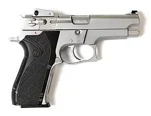 The Smith & Wesson Model 59 was a 14+1round, semi-automatic pistol introduced in 1971.[48][49] It was the first standard double-action pistol to use a high-capacity 14-round staggered-magazine. It went out of production a decade later in 1980 when the improved second generation series was introduced (the Model 459). The Model 459 was again improved into a third generation series, the 5904. Stainless steel versions of the second and third generation models were also widely popular, and were designated the Models 659 and 5906, respectively. The original Model 59 was manufactured in 9×19mm Parabellum caliber with a wider anodized aluminum frame (to accommodate a double-stack magazine), a straight backstrap, a magazine disconnect (the pistol will not fire unless a magazine is in place), and a blued carbon steel slide that carries the manual safety. The grip is of three pieces made of two nylon plastic panels joined by a metal backstrap. It uses a magazine release located to the rear of the trigger guard, similar to the Colt M1911.