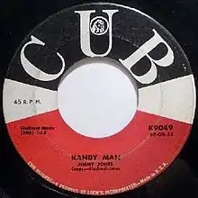 It was originally recorded by The Sparks Of Rhythm, a group Jones had been a member of when he wrote it, although he was not with them when they recorded it. That version was in a minor key, and had a completely different melody. When Jimmy Jones recorded it, the song was changed to a major key, with a completely different melody. In 1959, Jones recorded the song himself, in a version which had been reworked by Blackwell,[2] who also produced the session. In addition, Blackwell also provided the whistling, which is prominently heard throughout the whole song. "Handy Man" reached No. 3 on the R&B charts and No. 2 on the Billboard Hot 100 in 1960 behind Theme from A Summer Place by Percy Faith, becoming a million seller.[3]