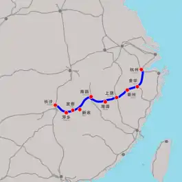 Hangzhou–Changsha high-speed railway is a China Railway High-speed line connecting Hangzhou, Nanchang, and Changsha, respectively the provincial capitals of Zhejiang, Jiangxi, and Hunan. This railway forms a section of the Shanghai–Kunming high-speed railway, part of the National Railway Grid Network, as one of the four major east-west lines.