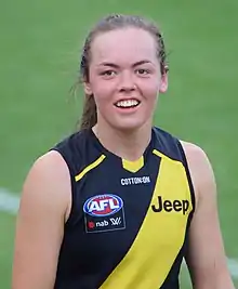 She made her AFLW debut during round 7 of the 2019 season in a match against Greater Western Sydney at UNSW Canberra Oval.[2] She was omitted from the Geelong side that played in a losing preliminary final the following week.[3] At season's end she was delisted by Geelong, having played just one AFLW match.[4] Burchell joined expansion club Richmond as delisted free agent later that month.[5]