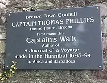 A controversial plaque was erected during 2006 in the town of Brecon, Wales, along Captains Walk. The plaque is to memorialise the life of Captain Thomas Phillips, slave trader.