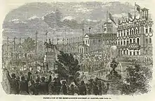 As the first station was built at street level and therefore hindered the expansion of the city, 8 km (5.0 mi) of railway track were laid for a new rail network that was grade-separated from the street system. In addition, the new station had a long system of tracks. After preparatory work in 1873 to relocate the workshops to Leinhausen and the marshalling yards to Hainholz and the construction of freight diversion routes, construction of the core network, which still exists, began in 1875.[4] The new station building was designed by Hubert Stier in the Renaissance Revival style. It was again a symmetrical building with a main hall and two wings, each of which was completed by a corner building. The eastern corner building with its Kaiserzimmer ("Emperor's room") had a separate driveway. The building was designed in yellow brick with red brick stripes and a sandstone base. The four platforms with seven platform tracks and two through tracks were spanned by two halls with a 37-metre (121 ft) span. After the demolition of the nearly 30-year-old station building, the construction of the new station began in April 1877. It was opened on 22 June 1879 after 26 months of construction. Access to the platforms was via three tunnels and there were two more tunnels for the transport of luggage and for postal traffic. The system of tracks finished in 1883 comprised seven platform tracks and two central through tracks for freight trains. The train sheds consisted of two separate halls, each 37 m (121 ft) wide and 167.5 m (550 ft) long with a 9.25 m (30.3 ft) wide space between them for the two through tracks. The construction cost 12.7 million marks for the buildings and 22.5 million marks for the entire station precinct.[5]