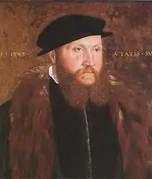 Holbein's portrait style altered after he entered Henry's service. He focused more intensely on the sitter's face and clothing, largely omitting props and three-dimensional settings.[85] He applied this clean, craftsman-like technique to miniature portraits such as that of Jane Small, and to grand portraits such as that of Christina of Denmark. He travelled with Philip Hoby to Brussels in 1538 and sketched Christina for the king, who was appraising the young widow as a prospective bride.[86] John Hutton, the English ambassador in Brussels, reported that another artist's drawing of Christina was "sloberid" (slobbered) compared to Holbein's.[87] In Wilson's view, Holbein's subsequent oil portrait is "the loveliest painting of a woman that he ever executed, which is to say that it is one of the finest female portraits ever painted".[88] The same year, Holbein and Hoby went to France to paint Louise of Guise and Anna of Lorraine for Henry VIII. Neither portrait of these cousins has survived.[89] Holbein found time to visit Basel, where he was fêted by the authorities and granted a pension.[90] On the way back to England, he apprenticed his son Philipp to Basel-born goldsmith Jacob David in Paris.[91]