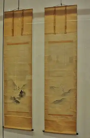 He contributed pieces to the Kyoto Imperial Palace during its reconstruction subsequent to a fire in 1854, one of the most famous being a cherry tree fusuma-e in the Sakura-no-ma (Cherry Blossom Room).[38] He died at 59 in 1872, and was buried at Tenshōji Temple.[39] Today, his works can be seen in the Kyoto Imperial Palace, the Kyoto National Museum and the British Museum.