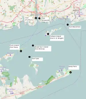 The Harbor Defenses of Long Island Sound was a United States Army Coast Artillery Corps harbor defense command.[1] It coordinated the coast defenses of Long Island Sound and Connecticut from 1895 to 1950, beginning with the Endicott program. These included both coast artillery forts (all but two on islands in the sound) and underwater minefields. The area defended included the approach via the Sound to New York City, the port cities and manufacturing centers of New London, New Haven, and Bridgeport, and eventually included the submarine base and shipyard in Groton. The command originated circa 1900 as an Artillery District, was renamed Coast Defenses of Long Island Sound in 1913, and again renamed Harbor Defenses of Long Island Sound in 1925.[4][5][6][7]