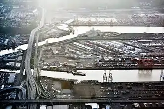 Harbor Island is an artificial island in the mouth of Seattle, Washington's Duwamish River where it empties into Elliott Bay. Built by the Puget Sound Bridge and Dredging Company, Harbor Island was completed in 1909 and was then the largest artificial island in the world, at 350 acres (1.4 km2).[1] Since 1912, the island has been used for commercial and industrial activities, including secondary lead smelting, shipbuilding and repair, bulk petroleum storage, metal fabrication, and containerized cargo shipping. Warehouses, laboratories, and other buildings are located on the island.