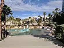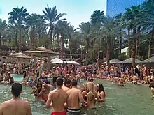 Upon its opening, the resort included the Hard Rock Beach Club, featuring a pool, cabanas, and a sandy beach.[27] Each year from 1996 to 2006, the hotel hosted beach volleyball tournaments.[lower-alpha 2] During the 1999 expansion, the pool and beach club area was expanded by two acres,[279] and the pool featured two floating craps tables.[47] The pool and beach club became one of the most popular party spots in Las Vegas.[106] In 2004, the resort launched a public pool party known as Rehab, which became a successful, annual event until its end in 2018.[280]