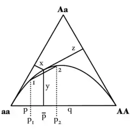 It is possible to represent the distribution of genotype frequencies for a bi-allelic locus within a population graphically using a de Finetti diagram. This uses a triangular plot (also known as trilinear, triaxial or ternary plot) to represent the distribution of the three genotype frequencies in relation to each other. It differs from many other such plots in that the direction of one of the axes has been reversed.[16] The curved line in the diagram is the Hardy–Weinberg parabola and represents the state where alleles are in Hardy–Weinberg equilibrium. It is possible to represent the effects of natural selection and its effect on allele frequency on such graphs.[17] The de Finetti diagram was developed and used extensively by A. W. F. Edwards in his book Foundations of Mathematical Genetics.[18]