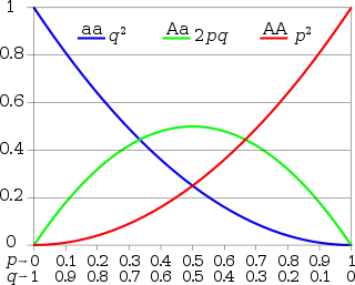 In the simplest case of a single locus with two alleles denoted A and a with frequencies f(A) = p and f(a) = q, respectively, the expected genotype frequencies under random mating are f(AA) = p2 for the AA homozygotes, f(aa) = q2 for the aa homozygotes, and f(Aa) = 2pq for the heterozygotes. In the absence of selection, mutation, genetic drift, or other forces, allele frequencies p and q are constant between generations, so equilibrium is reached.