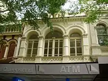 The lower level Queen Street facade has undergone numerous changes while the upper level is mostly intact. This consists of three semicircular arched window openings, the central arch being larger than the ones to either side. This central arch originally had two smaller archways supported on a slender central Corinthian column above which was a small circular window. The original sash windows of these openings have been replaced by large casements. The three openings are separated by pilasters with Corinthian capitals. Below each window is a balustrade of roundels, with a rosette in each circle. Above the arches is a continuous decorative label mould of floral motifs, with floral label stops. The cornice is made prominent by a row of dentils, and four sets of elaborate paired brackets. Above the cornice is an ornate parapet with a central triangular pediment containing three arched recesses echoing the window openings below. The rest of the parapet has a balustrade of small arched balusters, and at each end of the parapet is a pedestal supporting a vase. A vase also stands at the peak of the central pediment.[1]