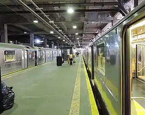 The new terminal, upon completion, was intended to replace the former terminal at 145th Street station due to the proximity of switches that prevented that station's lengthening to accommodate ten-car trains.[15] However, plans to shut down 145th Street were cancelled due to protests from local residents.[16] 148th Street Station opened on May 13, 1968.[17] The project was completed at a relatively low cost because the extension made use of two existing yard tracks.[11][17][18][lower-alpha 1] The station cost $1.29 million, track improvements cost $3.178 million, and signaling cost $3.553 million.[20] The name of the station was originally planned to be 149th Street–Seventh Avenue, but because of possible confusion with 149th Street–Grand Concourse, it was changed to 148th Street–Lenox Terminal.[13]