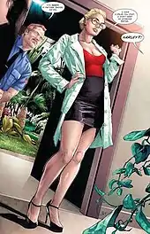 ![]() Harley Quinn, as she appeared on a variant cover of Harley Quinn #1 (April 2016), in her updated looks while holding parts of her original costume in both hands. Art by Terry Dodson. | |