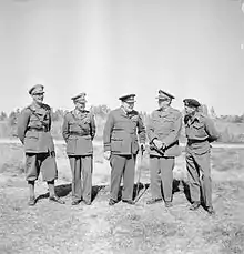 After Dunkirk, Alexander returned to the United Kingdom and continued to command I Corps, now guarding the coasts of Yorkshire and Lincolnshire.[51] He was promoted acting lieutenant-general in July 1940,[52] and appointed the General Officer Commanding-in-Chief (GOC-in-C) of Southern Command, which was responsible for the defence of south-west England.[53][54] His rank of lieutenant-general was made permanent in December 1940.[51]