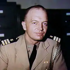 After being promoted to the rank of commander, he joined the staff of Admiral William F. Halsey, Commander of the Third Fleet in the Pacific Theater. He was awarded the Legion of Merit for meritorious service in this position. After almost two and a half years of service, he was promoted to the rank of captain on September 27, 1945 and was released from active duty in November of the same year.[30]