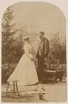 Minny met Leslie Stephen at a dinner party held by his mother, Lady Stephen, with whom they were friends.[1][3] Elizabeth Gaskell, also present, told Stephen later that she had foreseen their marriage from this early stage.[1] Although the courtship was slow, the couple became engaged in December 1866, and married on 19 June the following year. Minny's sister, Anne, continued to live with the couple at the house she and Minny had bought together.[1]