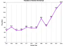 The population of Harrison Hot Springs has been steadily growing in recent years. The Canadian Census has reported 655 people in 1991, 898 in 1996, 1343 in 2001, and 1573 in 2006.[6][7][8] It has since receded slightly to 1,468 in 2011 and 2016.[4]