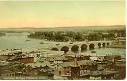 Just three years after Colt's first factory opened, the Sharps Rifle Manufacturing Company set up shop in 1852 at a nearby site along the now-buried Park River, located in the present-day neighborhood of Frog Hollow. Their factory heralded the beginning of the area's transformation from marshy farmland into a major industrial zone. The road leading from town to the factory was called Rifle Lane; the name was later changed to College Street and then Capitol Avenue.[39] A century earlier, mills had located along the Park River because of the water power, but by the 1850s water power was approaching obsolescence. Sharps located there specifically to take advantage of the railroad line that had been constructed alongside the river in 1838.