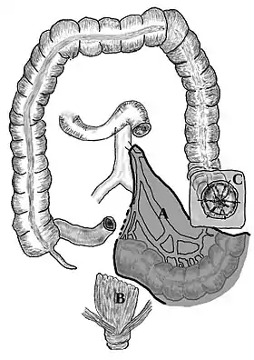 ![]() Hartmann's operation: A - extended sigmoid resection (gray); B - rectal stump closed; C - colostomy. | |