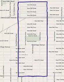 The Harvard Park neighborhood touches Vermont Square on the north, Vermont-Slauson on the east, Manchester Square on the south, and Chesterfield Square on the west.[2] It is bounded by West 54th Street on the north, Normandie Avenue on the east, Florence Avenue on the south and Western Avenue on the west.[1][3]