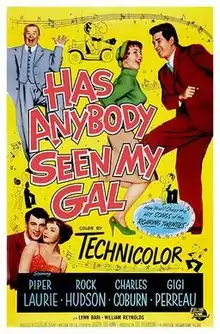 Has Anybody Seen My Gal? is a 1952 comedy film distributed by Universal-International, directed by Douglas Sirk, and stars Piper Laurie, Rock Hudson, Charles Coburn, and Gigi Perreau. Set in the 1920s, the film leans heavily on period detail, such as flappers, the Charleston and raccoon coats. It is named for the jazz song Has Anybody Seen My Gal? which was a hit for The California Ramblers during the '20s. Though the song is sung during the movie, its lyrics have no particular relation to the plot.
