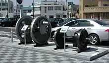A monument was erected on the west side station forecourt, consisting of the driving wheels of former JNR Class D51 steam locomotive D51 484 and the wheels of a former 115 series electric multiple unit train.[7]