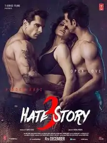 Hate Story 3 is a 2015 Indian Hindi-language erotic thriller film directed by Vishal Pandya.[3][4] Produced by T-Series, it stars Sharman Joshi, Karan Singh Grover, Zareen Khan and Daisy Shah in lead roles, and Priyanshu Chatterjee in a pivotal role.[5] Written by Vikram Bhatt and Madhuri Banerji, the film is part of the Hate Story film series. The film was released on 4 December 2015 and was a box office success.[6]
