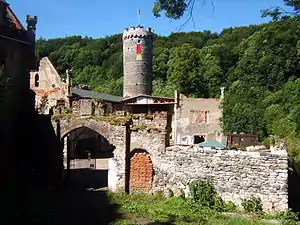 Hauenštejn (Czech var.: Horní hrad; German: Hauenstein) is a medieval castle in the Czech Republic. The castle is private property of Pavel Palacký, a descendant of František Palacký.