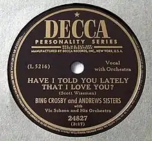"Have I Told You Lately That I Love You?" is a popular song written by Scotty Wiseman for the 1944 musical film, Sing, Neighbor, Sing and performed by Lulu Belle and Scotty. It was the greatest hit of Wiseman and his wife and one of the first country music songs to attract major attention in the pop music field. Its repeating fourth line is "Well darling, I'm telling you now." Although it was featured in the movie, it wasn't released by them until 1947 (and then again in 1956). The first released version of this song was by Gene Autry in 1945.