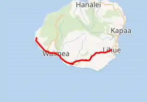 Route 50 is a 33-mile (53 km) road that stretches from Route 56 at the junction of Rice Street in Lihue to a point approximately 1/5 mile north of the northernmost entrance of the Pacific Missile Range Facility on the western shore of Kauai. It is the longest numbered road on the island of Kauaʻi and is named Kaumualiʻi Highway.[2][3]