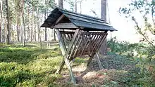 A hay rack is a light wooden or metal structure for feeding animals. It may be used to feed domestic livestock such as cattle,[1] horses,[2] and goats,[3] or it may placed in the woods to feed deer. Feeding deer is mostly done in the winter, when the other food sources (green forage) are scarce. Hay racks are filled with hay, and in addition to hay there is often also a mineral lick near the rack where the animals can obtain essential mineral nutrients.