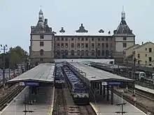 Haydarpaşa station (Turkish: Haydarpaşa Garı) is a railway station in Istanbul. Until 2012 the station was a major intercity, regional and commuter rail hub as well as the busiest railway station in Turkey. Haydarpaşa, along with Sirkeci station (on the other side of the Bosphorus), are Istanbul's two intercity and commuter railway terminals. From 19 June 2013 to 2018, all train service to the station was suspended due to the rehabilitation of the existing line for the new Marmaray commuter rail line. The station building still houses the headquarters for District 1 of the State Railways.
