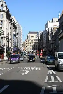 Haymarket runs parallel to Regent Street St James (Lower Regent Street) and together the two roads form a one-way system, Lower Regent Street taking northbound traffic and Haymarket taking southbound traffic. The two roads are classified as part of the A4 route from London to Avonmouth, near Bristol.