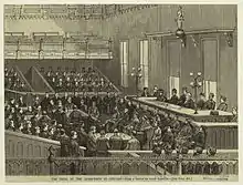 The trial, Illinois vs. August Spies et al., began on June 21, 1886, and went on until August 11. The trial was conducted in an atmosphere of extreme prejudice by both public and media toward the defendants.[69] It was presided over by Judge Joseph Gary. Judge Gary displayed open hostility to the defendants, consistently ruled for the prosecution, and failed to maintain decorum. A motion to try the defendants separately was denied.[70] The defense counsel included Sigmund Zeisler, William Perkins Black, William Foster, and Moses Salomon. Selection of the jury was extraordinarily difficult, lasting three weeks, and nearly one thousand people called. All union members and anyone who expressed sympathy toward socialism were dismissed. In the end a jury of 12 was seated, most of whom confessed prejudice against the defendants. Despite their professions of prejudice Judge Gary seated those who declared that despite their prejudices they would acquit if the evidence supported it, refusing to dismiss for prejudice. Eventually the peremptory challenges of the defense were exhausted. Frustrated by the hundreds of jurors who were being dismissed, a bailiff was appointed who selected jurors rather than calling them at random. The bailiff proved prejudiced himself and selected jurors who seemed likely to convict based on their social position and attitudes toward the defendants.[70] The prosecution, led by Julius Grinnell, argued that since the defendants had not actively discouraged the person who had thrown the bomb, they were therefore equally responsible as conspirators.[71] The jury heard the testimony of 118 people, including 54 members of the Chicago Police Department and the defendants Fielden, Schwab, Spies and Parsons. Albert Parsons' brother claimed there was evidence linking the Pinkertons to the bomb. This reflected a widespread belief among the strikers.[62]