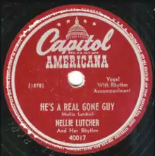 "He's a Real Gone Guy" is a song written and sung by Nellie Lutcher with backing on the record by a group called "Her Rhythm". Lutcher also played the piano on the record which was released in July 1947 on the Capitol Americana label (catalog no. 40017). It debuted on the Billboard magazine's race records chart on September 27, 1947, peaked at No. 2, and remained on the chart for 23 weeks.[1] It was ranked No. 9 on the magazine's year-end list of the most played race records of 1947.[2]