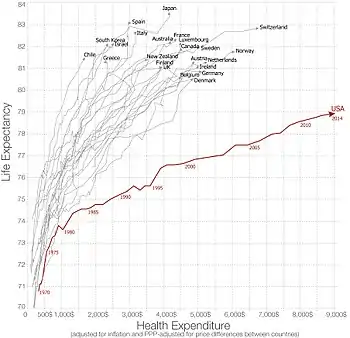 The United States life expectancy is 78.6 years at birth, up from 75.2 years in 1990; this ranks 42nd among 224 nations, and 22nd out of the 35 industrialized OECD countries, down from 20th in 1990.[8][9] In 2016 and 2017 life expectancy in the United States dropped for the first time since 1993.[10] Of 17 high-income countries studied by the National Institutes of Health, the United States in 2013 had the highest or near-highest prevalence of obesity, car accidents, infant mortality, heart and lung disease, sexually transmitted infections, adolescent pregnancies, injuries, and homicides.[11] A 2017 survey of the healthcare systems of 11 developed countries found the US healthcare system to be the most expensive and worst-performing in terms of health access, efficiency, and equity.[12] In a 2018 study, the USA ranked 29th in healthcare access and quality.[13]