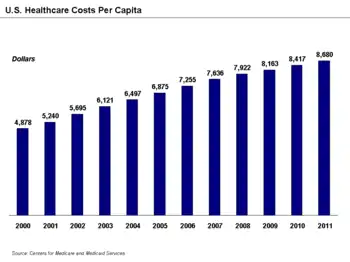 Aggregate U.S. hospital costs were $387.3 billion in 2011 – a 63% increase since 1997 (inflation adjusted). Costs per stay increased 47% since 1997, averaging $10,000 in 2011.[91] As of 2008, public spending accounts for between 45% and 56% of U.S. health care spending.[92] Surgical, injury, and maternal and neonatal health hospital visit costs increased by more than 2% each year from 2003–2011. Further, while average hospital discharges remained stable, hospital costs rose from $9,100 in 2003 to $10,600 in 2011, and were projected to be $11,000 by 2013.[93]