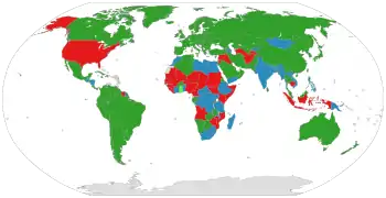The 2015 global average for under-five child mortality was 42.5 per 1000 live births.[48] The United States’ under-five child mortality of 6.5 is less than one sixth the global figure;[43] however, the 2015 rate in Canada was 5.3, in Greece 4.8, and in Finland 2.4.[49] The 2015 global average for maternal mortality was 216, the United States' average of 14 maternal deaths 100,000 live births is more than 15 times less, however Canada had half as many (7) and Finland, Greece, Iceland and Poland each only had 3.[44] While not as high in 2015 (14)[44] as in 2013 (18.5), maternal deaths related to childbirth have shown recent increases; in 1987, the mortality ratio was 7.2 per 100,000.[50] As of 2015, the American rate is double the maternal mortality rate in Belgium or Canada, and more than triple the rate in the Finland as well as several other Western European countries.[44]