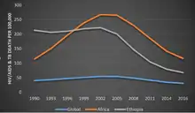 The most recent WHO global report classifies Ethiopia as one of the top 30 high burden countries for TB, TB/HIV and MDR-TB.[7] The TB prevalence estimates in Ethiopia shows a steady decline since 1995 with an average rate of 4% per year, which is accentuated in the last five years (annual decline of 5.4%). Likewise, the estimates for TB incidence reached a peak value of 431/100,000 population in 1997, and has been declining at an average rate of 3.9% per year since 1998, with annual decline of 6% within the last five years. The incidence estimate for all forms of TB in 2015 is 192/100,000 population. TB mortality rate has also been declining steadily since 1990 and reached 26/100,000 population in 2015. The decline in prevalence rate for all forms of TB has declined from 426/100,100 in 1990 to 200/100,000 population in 2014 (53% reduction). Similarly, the TB incidence rate has dropped from 369 in 1990 to 192/100,000 population in 2015 (48% reduction), after a peak of 421/100,000 in 2000. Furthermore, TB related mortality rate has been declining steadily over the last decade from 89/100,000 in 1990 to 26/100,000 in 2015 (70% reduction from 1990 level).