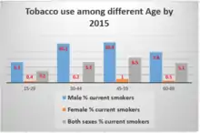 Tobacco use is the major single known risk factor for non-communicable diseases from the four listed main risk factors (diet, physical activity, and harmful use of alcohol).[31] NCDs are the leading cause of premature death and disability in Ethiopia accounts for about 42% of deaths, of which 27% are premature deaths before 70 years of age.[32] NCDs are estimated to account for 39% of all deaths in Ethiopia, while 71% in the world. Recently, the burden of these diseases is rising rapidly among populations in the low-income countries.[33]