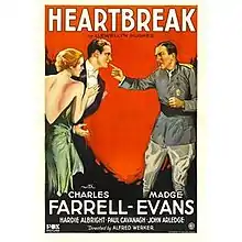 Heartbreak (aka Love and War) is a 1931 American Pre-Code war drama film directed by Alfred L. Werker and starring Charles Farrell, Madge Evans and Paul Cavanagh.[1] The film was set primarily in Italy as an exotic locale but was actually filmed in California with the San Gabriel Mountains east of the Los Angeles Basin, standing in for the Italian Alps. The popularity of aviation films on World War I such as Heartbreak was still strong, but by 1934, was perceptibly waning.[2]