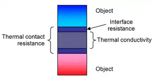 - For each interface between two objects in contact with each other, there will be a temperature drop across the interface. For such composite systems, the temperature drop across the interface may be appreciable.[12] This temperature change may be attributed to what is known as the thermal contact resistance.[12] Thermal interface materials (TIM) decrease the thermal contact resistance.