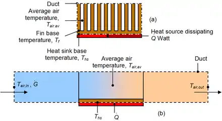 Consider a heat sink in a duct, where air flows through the duct. It is assumed that the heat sink base is higher in temperature than the air. Applying the conservation of energy, for steady-state conditions, and Newton’s law of cooling to the temperature nodes shown in the diagram gives the following set of equations: