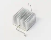 In general, the more surface area a heat sink has, the better it works.[4] However, this is not always true. The concept of a pin fin heat sink is to try to pack as much surface area into a given volume as possible.[4] As well, it works well in any orientation. Kordyban[4] has compared the performance of a pin fin and a straight fin heat sink of similar dimensions. Although the pin fin has 194 cm2 surface area while the straight fin has 58 cm2, the temperature difference between the heat sink base and the ambient air for the pin fin is 50 °C. For the straight fin it was 44 °C or 6 °C better than the pin fin. Pin fin heat sink performance is significantly better than straight fins when used in their intended application where the fluid flows axially along the pins (see figure 17) rather than only tangentially across the pins.