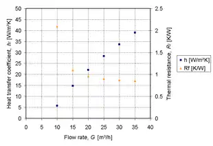 Using the equations 5 to 13 and the dimensional data in,[25] the thermal resistance for the fins was calculated for various air flow rates. The data for the thermal resistance and heat transfer coefficient are shown in the diagram, which shows that for an increasing air flow rate, the thermal resistance of the heat sink decreases.