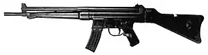 The origin of this rifle can be traced back to the final years of World War II when Mauser engineers at the Light Weapon Development Group (Abteilung 37) at Oberndorf am Neckar designed the Maschinenkarabiner Gerät 06 ( MKb Gerät 06, "machine carbine device 06") prototype assault rifle chambered for the intermediate 7.92×33mm Kurz cartridge, first with the Gerät 06 model using a roller-locked short recoil mechanism originally adapted from the MG 42 machine gun but with a fixed barrel and conventional gas-actuated piston rod.[3] However, it was realized that with careful attention to the mechanical ratios, the gas system could be omitted.[4] The resultant weapon, Gerät 06H (the "H" suffix is an abbreviation for halbverriegelt - "half-locked") was assigned the designation StG 45(M) (Sturmgewehr 45(M) , assault rifle 45) but was not produced in any significant numbers and the war ended before the first production rifles were completed.[5]
