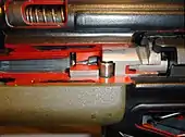 The G3 is a selective-fire automatic weapon that employs a roller-delayed blowback operating system. The two-piece bolt assembly consists of a breech (bolt head) and bolt carrier. The bolt is held in battery by two sliding cylindrical rollers that engage locking recesses in the barrel extension. The breech is opened when both rollers are compressed inward against camming surfaces driven by the rearward pressure of the expanding gases upon the bolt head. As the rollers move inward, recoil energy is transferred to the locking piece and bolt carrier which begin to withdraw while the bolt head slowly moves rearward in relation to the bolt carrier. As the bolt carrier clears the rollers, pressure in the bore drops to a safe level, the bolt head is caught by the bolt carrier and moves to the rear as one unit, continuing the operating cycle. Based on the geometric relationship arising from the angles of the roller contact surfaces of the locking piece and the barrel extension recesses, the recoil of the bolt head is delayed by a ratio of 4:1 for the 7.62×51mm NATO chambering. Thus during the same period of time, the bolt head carrier moves 4 times faster than the bolt head. This ratio is continued until the locking rollers have been withdrawn from the barrel extension recesses. The bolt features an anti-bounce mechanism that prevents the bolt from bouncing off the barrel's breech surface. The "bolt head locking lever" is a spring-loaded claw mounted on the bolt carrier that grabs the bolt head as the bolt carrier group goes into battery. The lever essentially ratchets into place with friction, providing enough resistance to being re-opened that the bolt carrier does not rebound. The spring-powered claw extractor is also contained inside the bolt while the lever ejector is located inside the trigger housing (actuated by the recoiling bolt).[6]