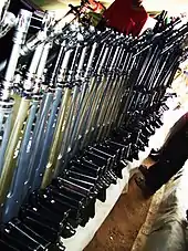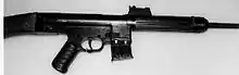 Initial production G3 rifles differed substantially from more recent models; early rifles featured closed-type mechanical flip-up sights (with two apertures), a lightweight folding bipod, a stamped sheet steel handguard, a wooden buttstock (in fixed stock models) or a telescopic metal stock.[6] Before delivery to the Bundeswehr, each G3 went through functional checks, zeroing the sight line and a shooting test at the factory. In the process, five shots were fired at a target at 100 metres (109 yd) with particularly accurate sighting-in ammunition. The 5-shot group could not exceed 120 mm (4.7 in) (1.2 mil/4.13 MOA) diameter. The weapon was modernized during its service life (among other minor modifications it received new sights, a different flash suppressor, and a synthetic handguard and shoulder stock), resulting in the most recent production models, the G3A3 (with a fixed polymer stock) and the G3A4 (telescoping metal stock). The rifle proved successful in the export market, being adopted by the armed forces of over 40 countries.[6] Of that figure, 18 countries undertook domestic production of the G3 under license.[8] Known manufacturers of the weapon included France (MAS), Greece (Hellenic Arms Industry), Iran (Defense Industries Organization), Luxembourg (Luxemburg Defense Technologie), Mexico, Myanmar, Norway (Kongsberg Våpenfabrikk), Pakistan (Pakistan Ordnance Factories), Portugal (FBP), Saudi Arabia (Military Industries Corporation (Saudi Arabia)), Sweden (Husqvarna Vapenfabrik AB and FFV Carl-Gustaf in Eskilstuna), Thailand, Turkey (MKEK) and the United Kingdom (Royal Ordnance).[6]