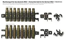 The MG5 uses M13 (designated DM60 by Germany) disintegrating belts for feeding ammunition from the left side. It can be fed with a Gurttrommel (belt drum) which contains a 50-round disintegrating belt and is fitted to the receiver on the left side. The Gurttrommel is not a true magazine but holds a curled 50-round belt preventing it from snagging, twisting and getting stuck during mobile assaults. Alternatively the MG5 can be fed with 80-round cloth ammunition pouches, a Gurtkasten (belt box) containing 120 rounds and fitted to the left side of the receiver or from stand-alone ammunition boxes. The ejection of empty M13 links is to the right side, and spent cartridge cases are ejected downwards through an ejection port located at the base of the receiver.
