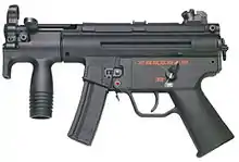 A civilian semiautomatic derivative of the MP5K known as the SP89 was produced that had a foregrip with a muzzle guard in place of the vertical grip.[26]